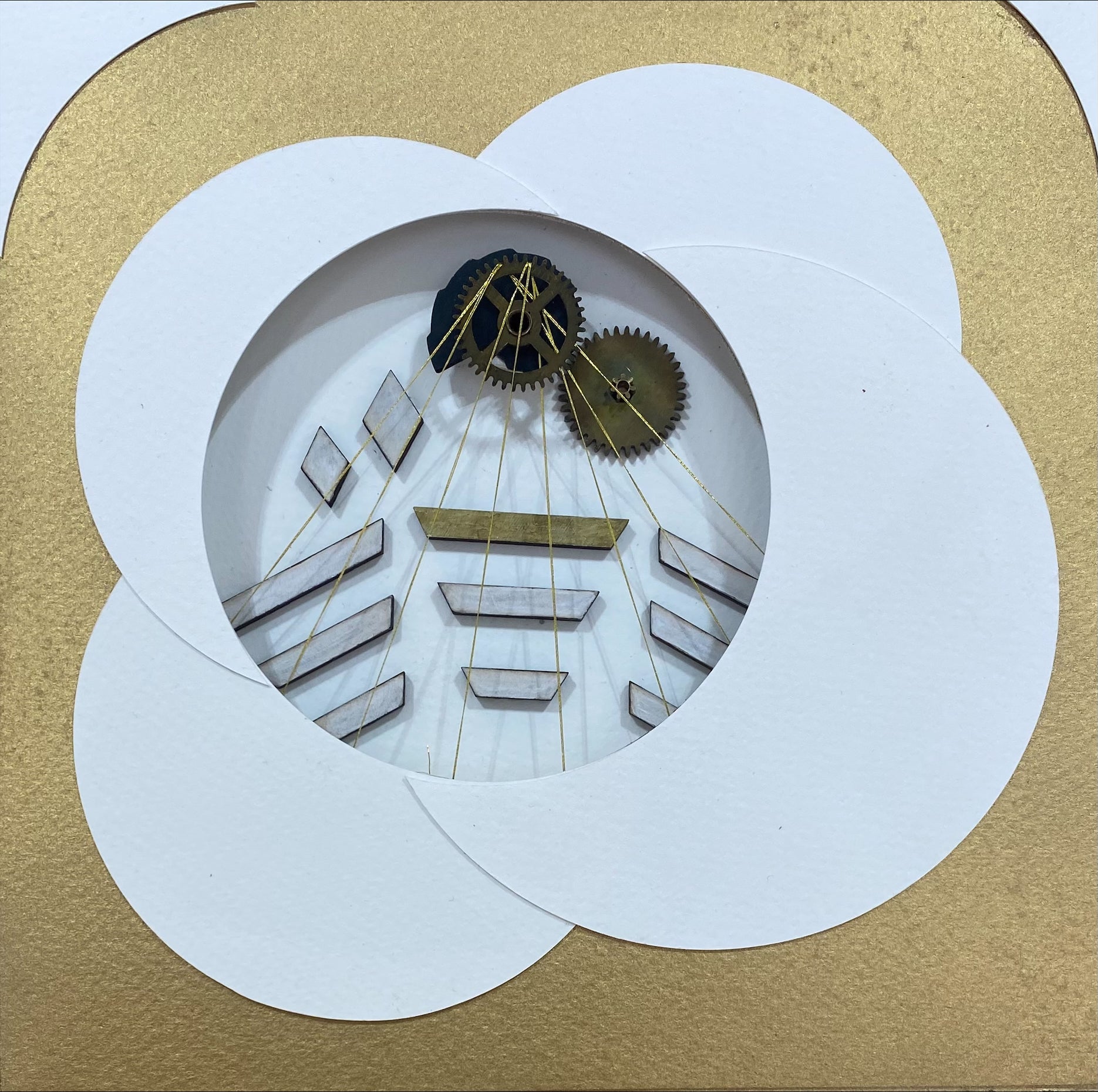 Most recently, Miller has been creating works of sculptural nature within the 2-dimensional shadow box displays. These mixed media pieces alchemize cuckoo clock gears, puzzle like laser cut wood pieces and meticulously weaving gold thread in a wonder of depth. She hopes they lure one in with curiosity and spirited exploration.